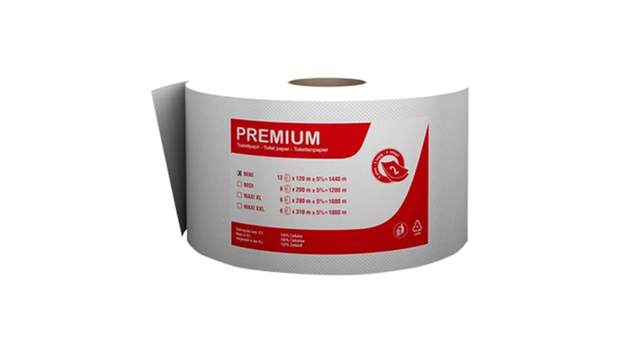 A Premium MINI fehér közületi toalettpapír, 100% cellulóz, 2 rétegű nagy forgalmú mellékhelyiségekbe ideális.