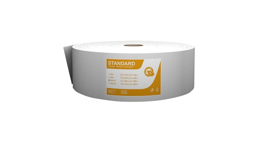 A Standard MAXI XL 80%-os fehér közületi toalettpapír, 100% reciklált, 2 rétegű nagy forgalmú mellékhelyiségekbe ideális.