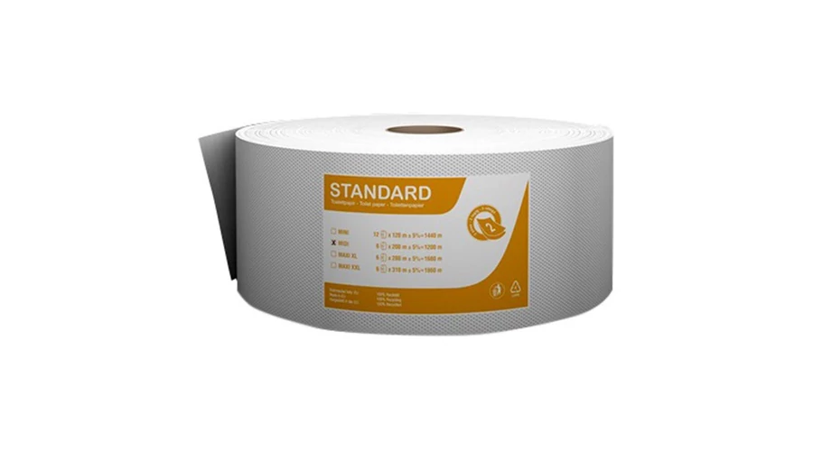 A Standard MIDI 80%-os fehér közületi toalettpapír, 100% reciklált, 2 rétegű nagy forgalmú mellékhelyiségekbe ideális.