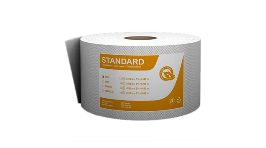 A Standard MINI 80%-os fehér közületi toalettpapír, 100% reciklált, 2 rétegű nagy forgalmú mellékhelyiségekbe ideális.