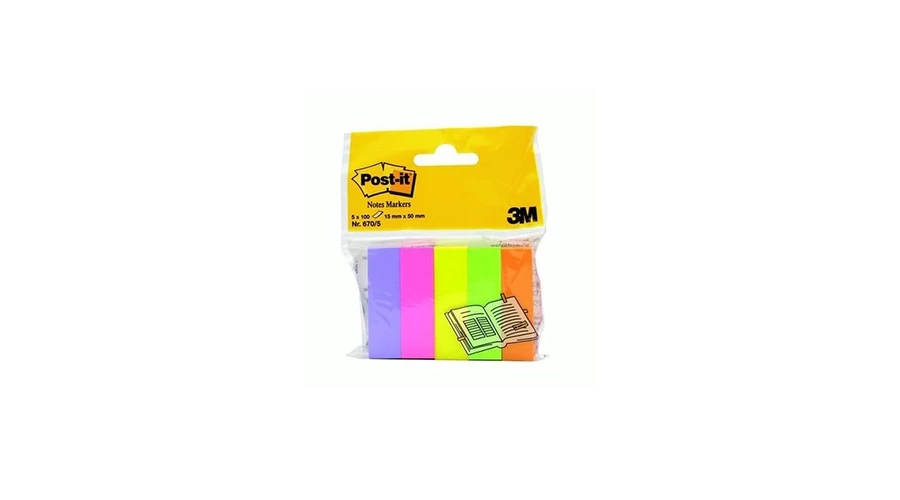 A Post-it oldaljelölő lapok tökéletesek rövid megjegyzések betűzésére, korrektúrázásra (telefonszámok, árak, hivatkozások). Írható felület, papír alapanyag. Feltűnő, 5 féle neon színű jelölő egy csomagban. Méret: 15x50 mm. 5x100 lapos.