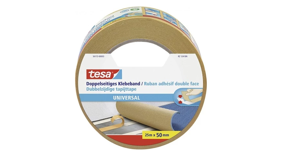 A tesa® univerzális kétoldalas szalag egy öntapadó padlószőnyeg ragasztó. Számos más alkalmazáshoz is megfelelő, például szőnyegek rögzítése, kézműveskedés és dekorálás. Ez a sokoldalú szalag sokféle szilárd, sík és sima felületű anyagon képes tapadni. A gyors és könnyű rögzítés érdekében kézzel könnyen téphető, melynek köszönhetően ideális kétoldalas barkácsszalag dekoráláshoz. Kiemelkedően erős tapadású, és ideális bármilyen anyag tartós, beltéri rögzítésére.