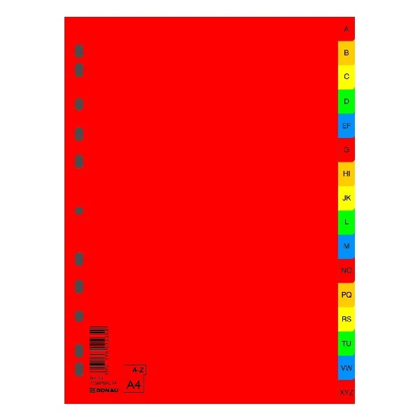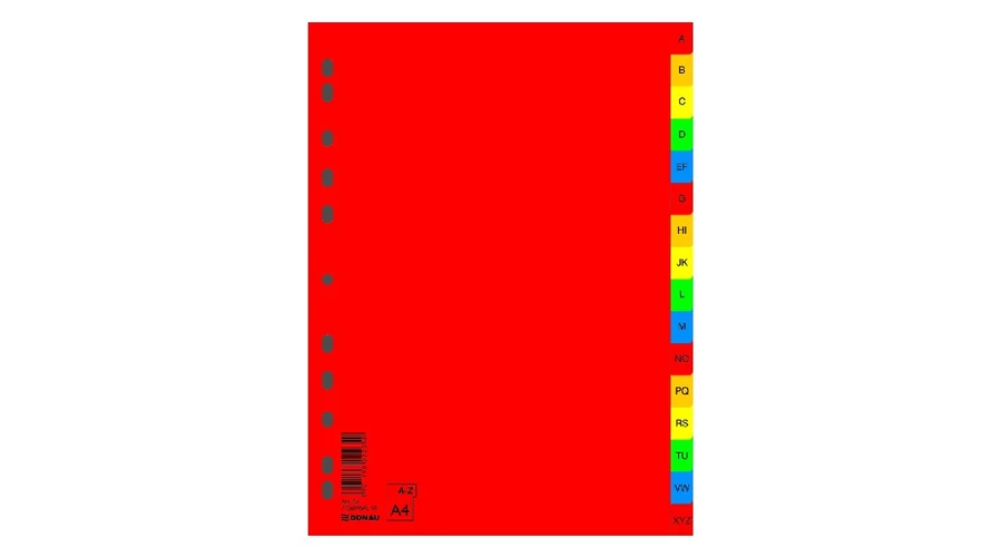 Piros A-Z regiszterek euro lyukasztással és színes jelölőkkel, előnyomtatott betűrenddel: A - Z. 16 db lap készlet külön csomagolva.