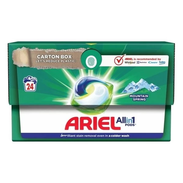 Az Ariel, - amely a Whirlpool, Electrolux, Candy és Beko mosógépgyártók által is ajánlott márka, - bemutatja az Ariel All-in-1 PODS® Mountain Spring mosókapszulát, amely ragyogó folteltávolítást nyújt hidegvizes mosásnál is. Hidegvizes mosáshoz tervezett különleges technológiákat, például Cool Clean technológiát alkalmaz. Ráadásul az újrahasznosítható ECOCLIC csomagolásának köszönhetően az Ariel mosókapszula segít a műanyaghulladék csökkentésében! Mindössze legfeljebb 5% műanyagot tartalmaz, és tökéletesen alkalmas a PODS mosókapszulák megfelelő tárolására. Vízzel érintkezve a 100%-ig vízben oldódó PODS filmréteg teljesen feloldódik, és az Ariel All-in-1 PODS Mountain Spring intenzív folteltávolító technológiája minden eddiginél alaposabb és hatékonyabb tisztítást végez. Figyelmeztetés: A termék egészségre ártalmas lehet és súlyos sérüléseket okozhat! Az Ariel All-in-1 PODS mosókapszula gyermekektől mindig távol tartandó! Mélytisztító hatás: Az Ariel Ariel All-in-1 PODS® mosókapszula ragyogó folteltávolítást kínál hidegvizes mosásnál isAjánlott mosószermárka: Az Arielt a Whirlpool Electrolux Candy és Beko is ajánlja!